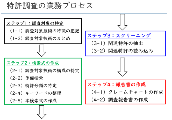 この図にあるように、特許調査のステップ2では、(2)検索式の作成をすることになります。