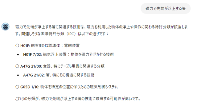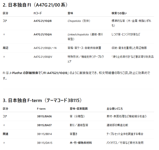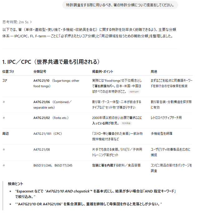 また、「特許調査をする際に用いるべき、箸の特許分類について提案をしてください。」とChatGPT o3に指示をした結果を示します。