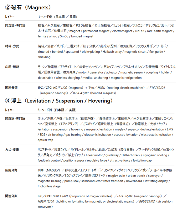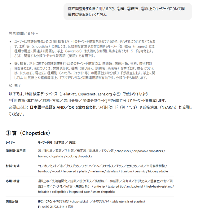 「特許調査をする際に用いるべき、①箸、②磁石、③浮上のキーワードについて網羅的に提案をしてください。」とChatGPT o3に指示をした結果を示します。