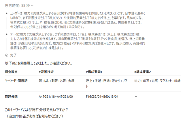 筆者の作成したGPTsである生成AI先行技術調査でも、1次検索の前に、入力文の意味を解析して、技術要素を特定し、技術要素ごとに関連するキーワードを提案するように構築してあります(参考:生成AI先行技術調査GPTsの使い方)。