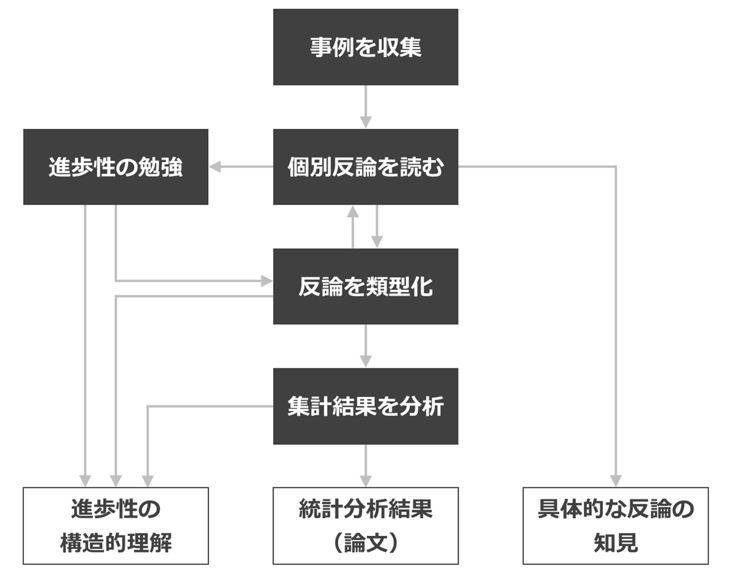 分析をするためには、各事例の反論内容を類型化して分類する必要があり、そのためには当然ながら進歩性の判断枠組みをちゃんと理解する必要がありました。このため、分析の傍ら審査基準や進歩性に関する書籍を読み漁り、そこから着想を得て分析手法をアップデートする・・・という、今思えば泥臭いやり方を繰り返して、最終的には何とか論文の形にまとめることができました。