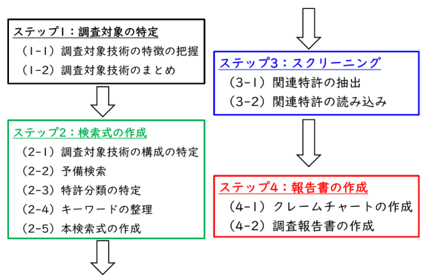 特許調査のステップ2の(2)検索式の作成は、以下の図に示すように、検索式の作成におけるタスク、(2-1)調査対象技術の構成の特定と、(2-2)予備検索、(2-3)特許分類の特定、(2-4)キーワードの整理、(2-5)本検索式の作成に細分化されることは前回も述べました。