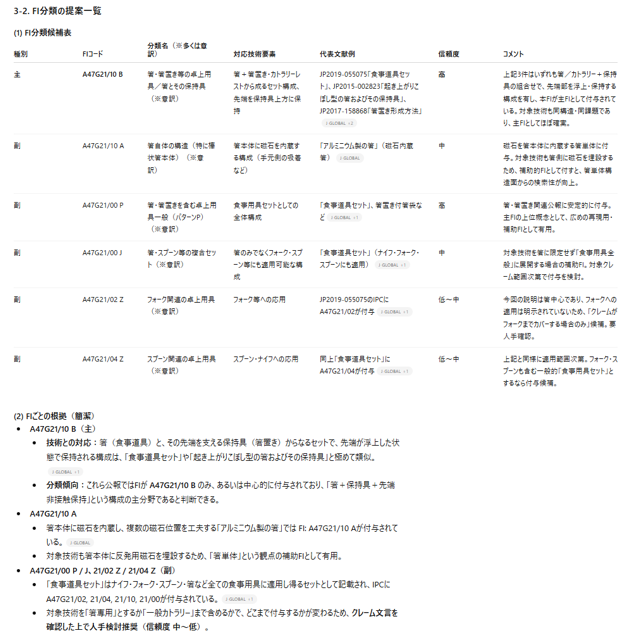 しっかりとFI・Fタームの候補と根拠を示してくれました。ここでも、参考となる特許文献と、Fターム・FIのリストを確認していることがわかります。