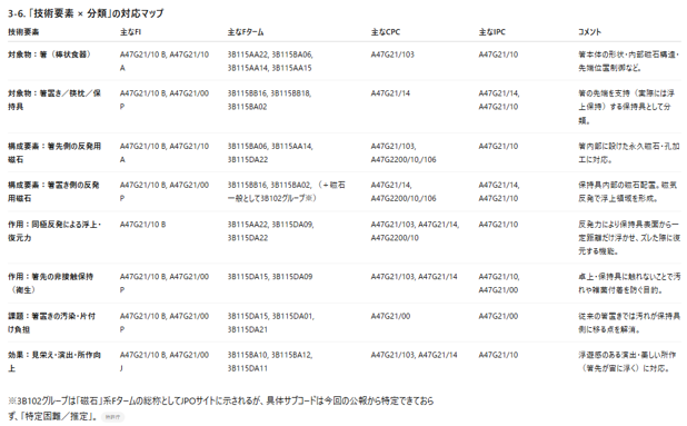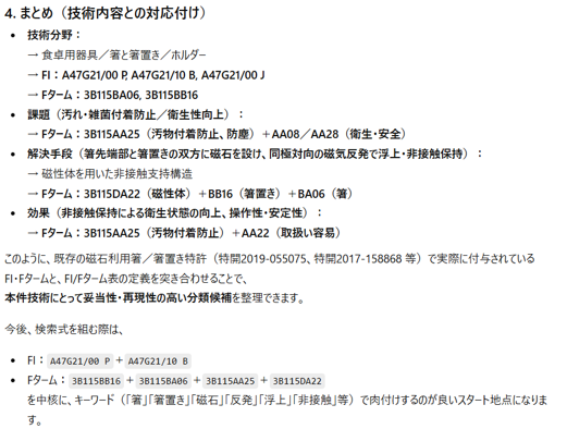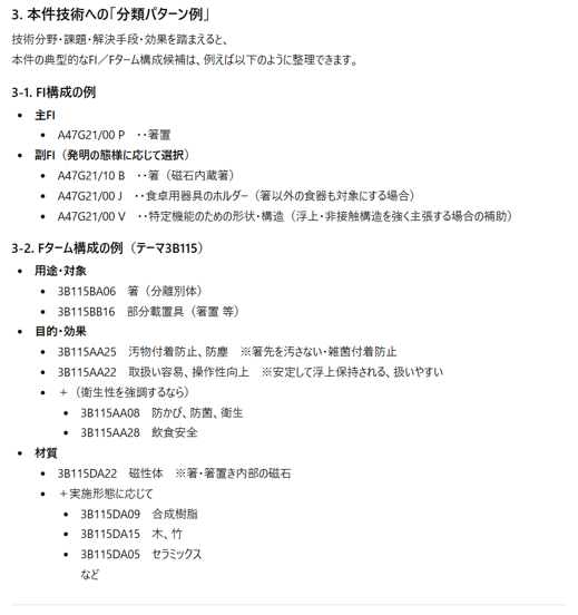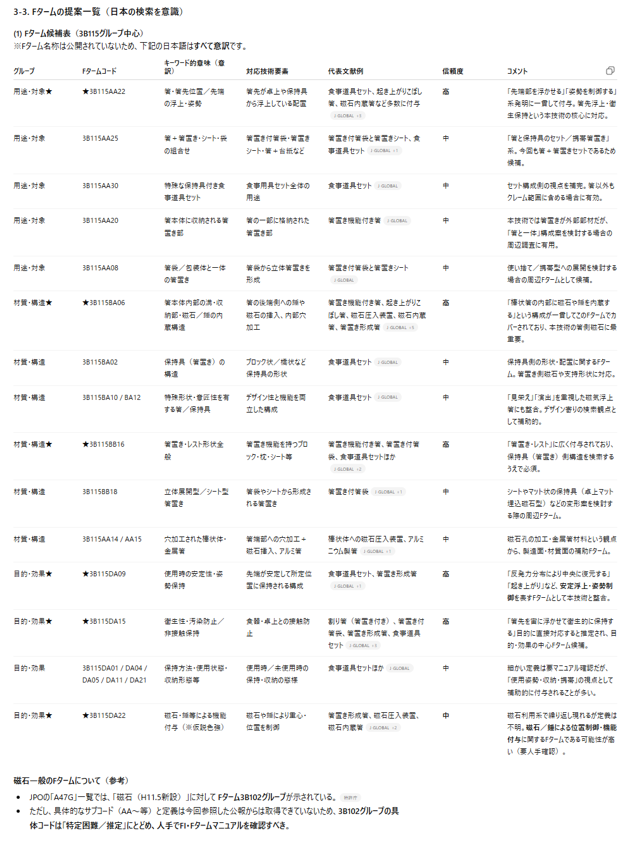 - 対象物(例:箸、食器、ホルダー、磁石利用の小物など)ごとに、用途が似ている他の特許群を探し、