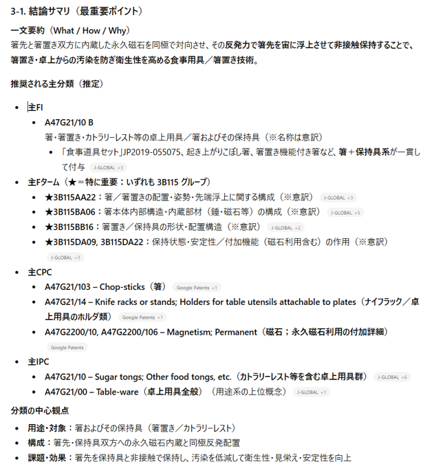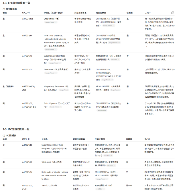 予備検索に続いて、ChatGPT(GPT-5.1 Auto)で特許分類を詳細に調査しました。