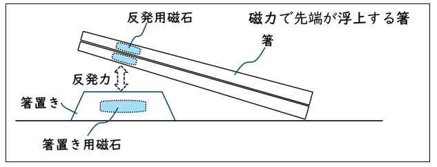 箸の先端部に反発用磁石を内蔵していて、箸置きに設けられた箸置き用磁石との間の反発力で箸の先端部が浮上する宙に浮く箸。