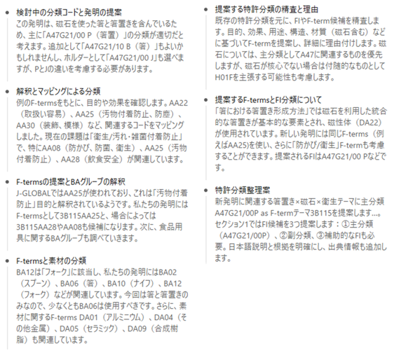 特許分類の特定は、これまでは、人が予備検索を行い、特許分類(FIやFターム)のリストを参照して、各項目をチェックしていた作業でが、予備検索を適切に行って、情報の下準備を整えた状態で、生成AIを活用すると人と同様の思考過程で、タスクを実行できることが分かります。