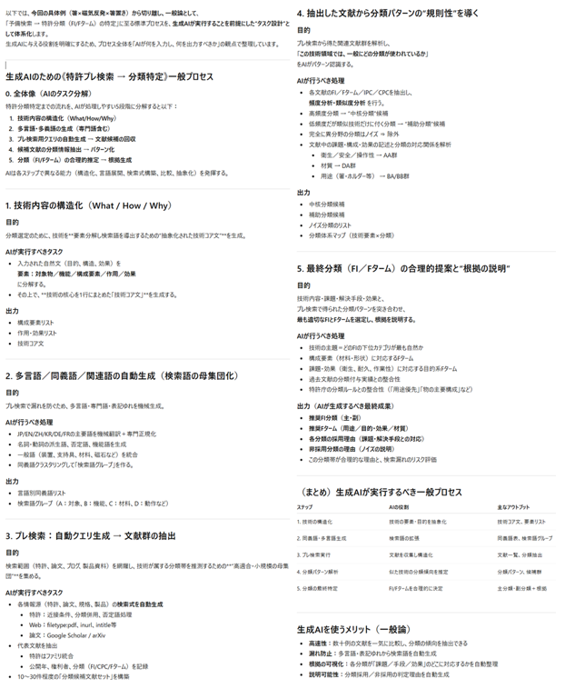 ここまでの、予備検索から、特許分類の特定に至るまでの過程を今回の具体論ではなく一般論で整理してください。 その際に、各プロセスを生成AIに行わせることを念頭に各タスクを検討してください。