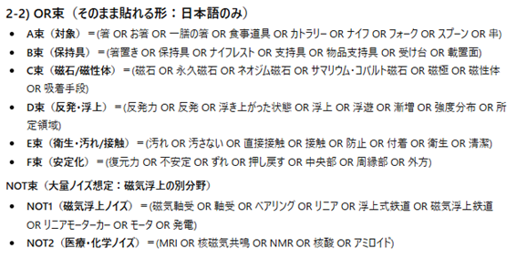 - 「NOT語」は、別分野混入の実例を想定して(例:浮上→磁気軸受/鉄道等)列挙