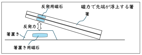 箸の先端部に反発用磁石を内蔵していて、箸置きに設けられた箸置き用磁石との間の反発力で箸の先端部が浮上する宙に浮く箸。