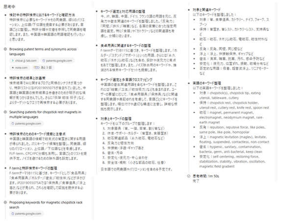 キーワードの特定は、これまでは、人が予備検索を行い、辞書やWEB情報、特許文献を精査していた作業でしたが、予備検索を適切に行って、特許分類を含む情報の下準備を整えた状態で、生成AIを活用すると人と同様の思考過程で、タスクを実行できることが分かります。