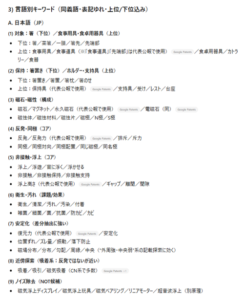 プロンプトをChatGPT(GPT-5 Thinking)で実行することで、いくつかの特許文献と候補となるキーワードについて同義語・表記ゆれが以下のように出力されましました(日本語のみ抜粋)。これでは不確実、不十分なので、詳細にキーワードを検討していきます。