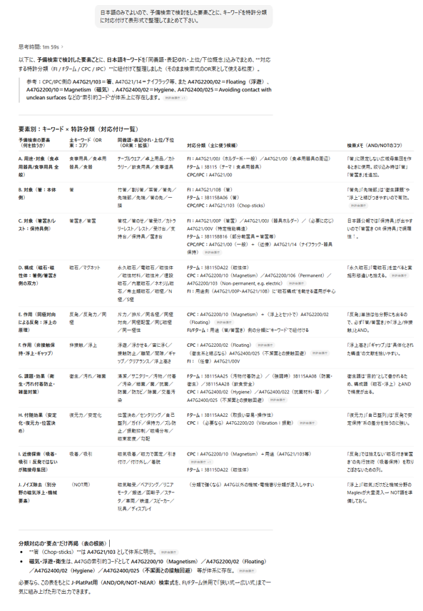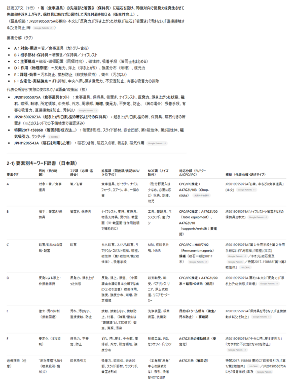 最初に調査要素に分解をして、参考となる特許文献を含むサマリを示してくれました。特許分類とセットで要素ごとにキーワードが示されています。