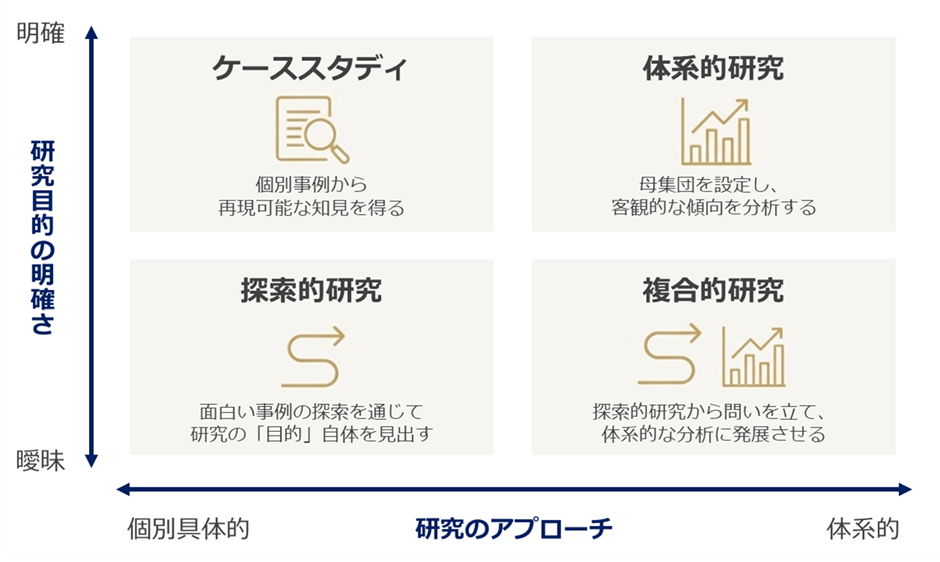 この2軸を組み合わせると、研究は4つのタイプに分かれます。