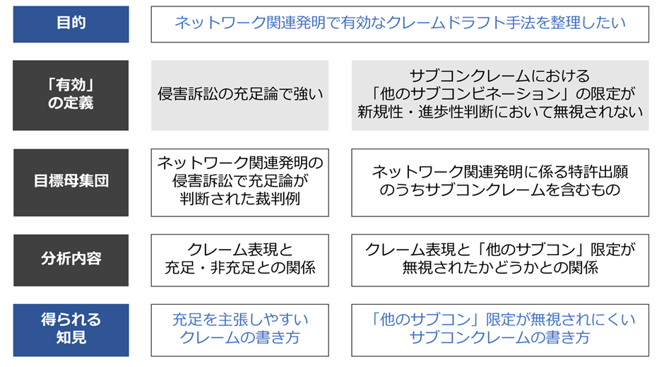 たとえば、前回の冒頭に挙げた「ネットワーク関連発明で有効なクレームドラフト手法を整理したい」という目的を考えてみましょう。