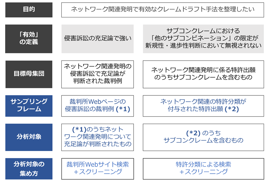 サブコンクレームを分析対象にしたいときは、「ネットワーク関連の特許分類が付与された特許出願」をサンプリングフレームとして取得し、そこからスクリーニングをして分析対象を抽出するしかなさそうです。